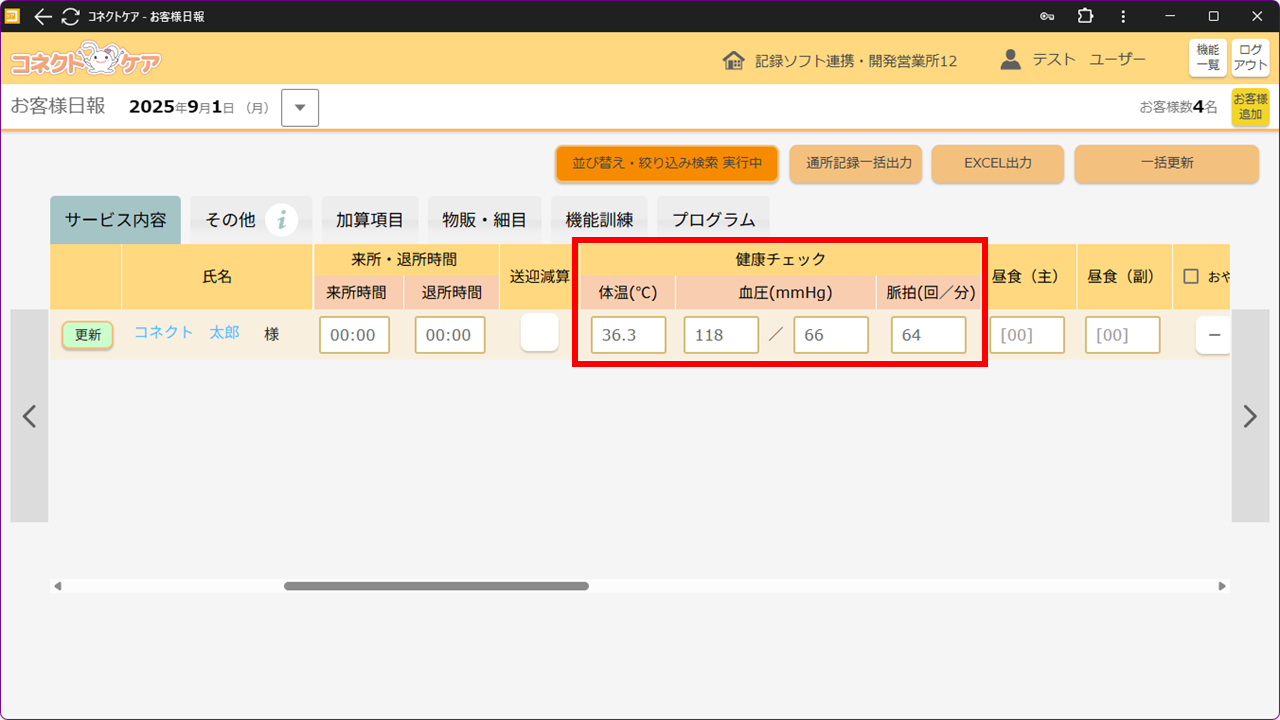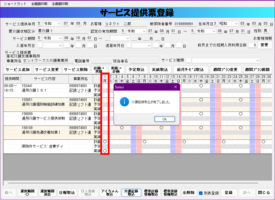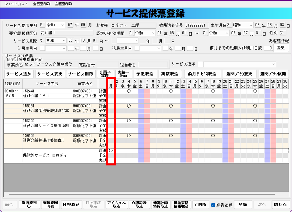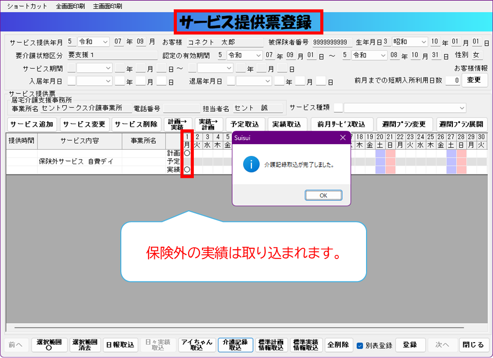 保険外サービスのみ、 実績欄に[○]が反映されます。