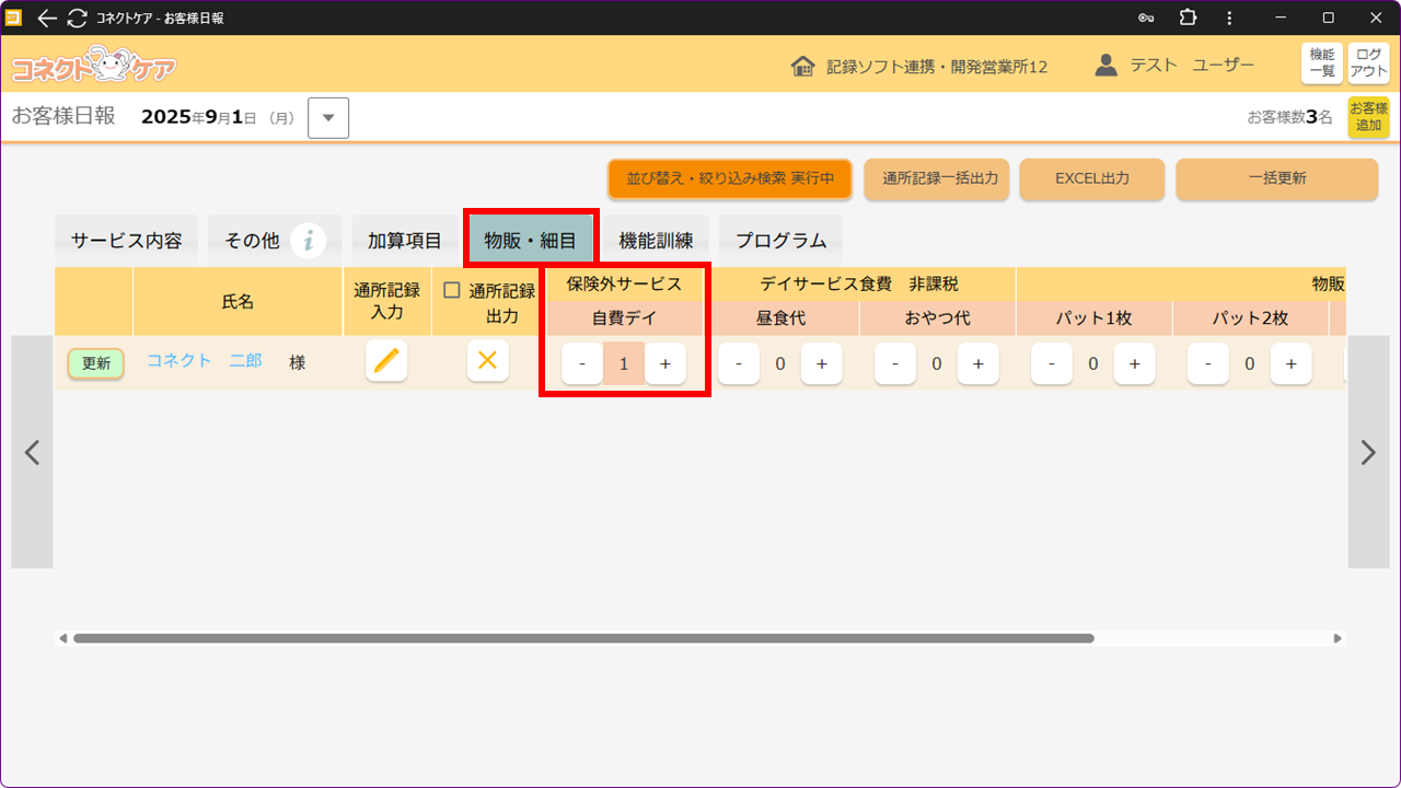 - 【物販・細目】タブで、自費利用の細目を[+]ボタンを押して[1]に設定します。