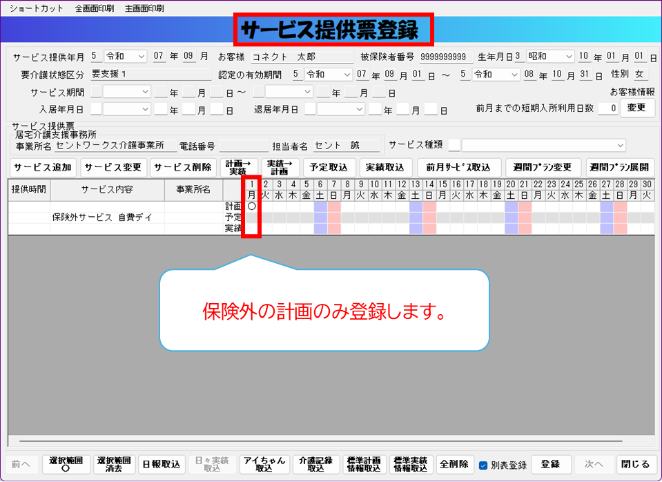 - Suisuiで、自費利用日は保険外サービスの計画にのみ[〇]を付けて登録します。