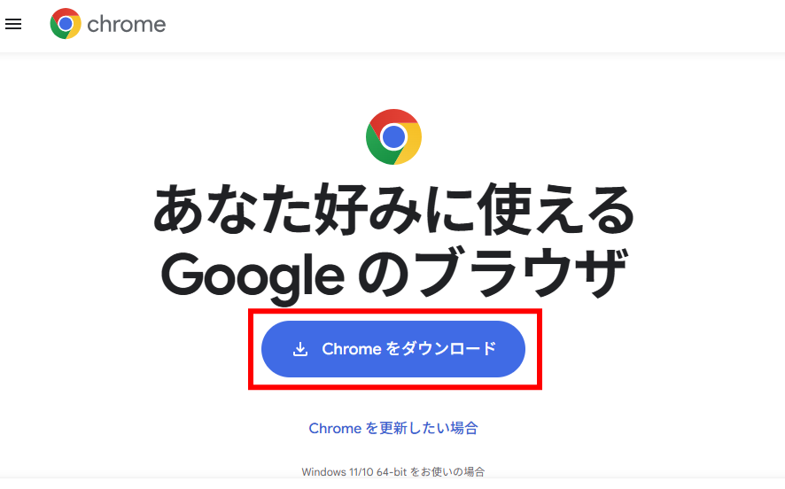 - 検索サイトで「Chrome」を検索し、公式ページを開きます。