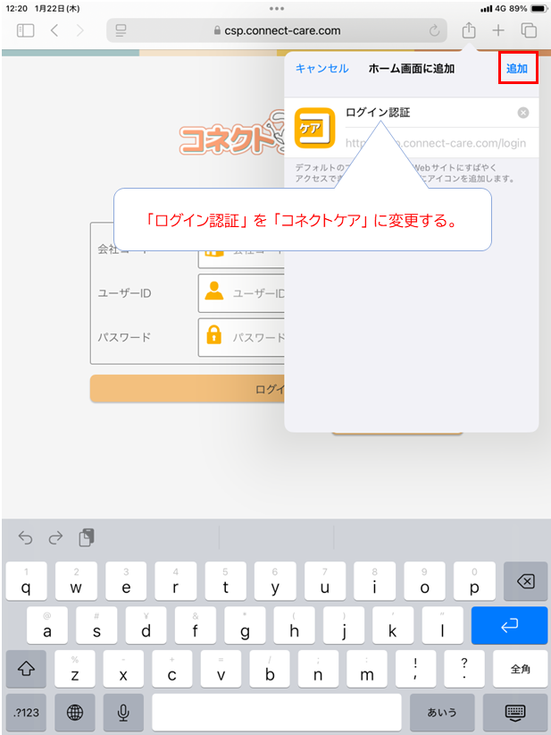 - ショートカット名を「ログイン認証」から「コネクトケア」に変更し、[追加]を押します。