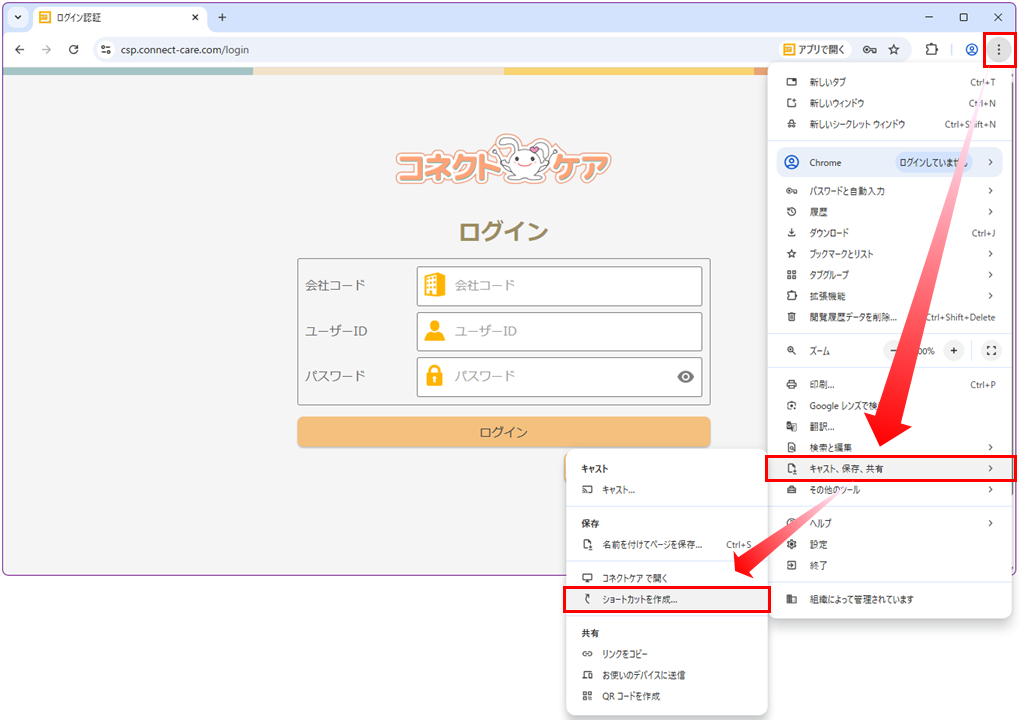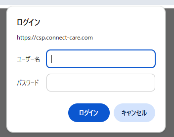 - Google Chromeで、コネクトケアのログイン画面を表示します。